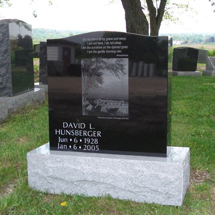 David Hunsberger was a well known photographer who specialized in working with the Mennonites in this area. One of his favourite photographs was used for the laser etched image on this stone. There are two good articles about his work at http://www.yourlocalheritage.ca/Report.php?ListType=Documents&ID=1764 and at http://observerxtra.com/mennonites-through-the-cameras-lens/#observerxtra=199:4:W3F,199:64:vy2;198:19:GKy,198:44:3LO .